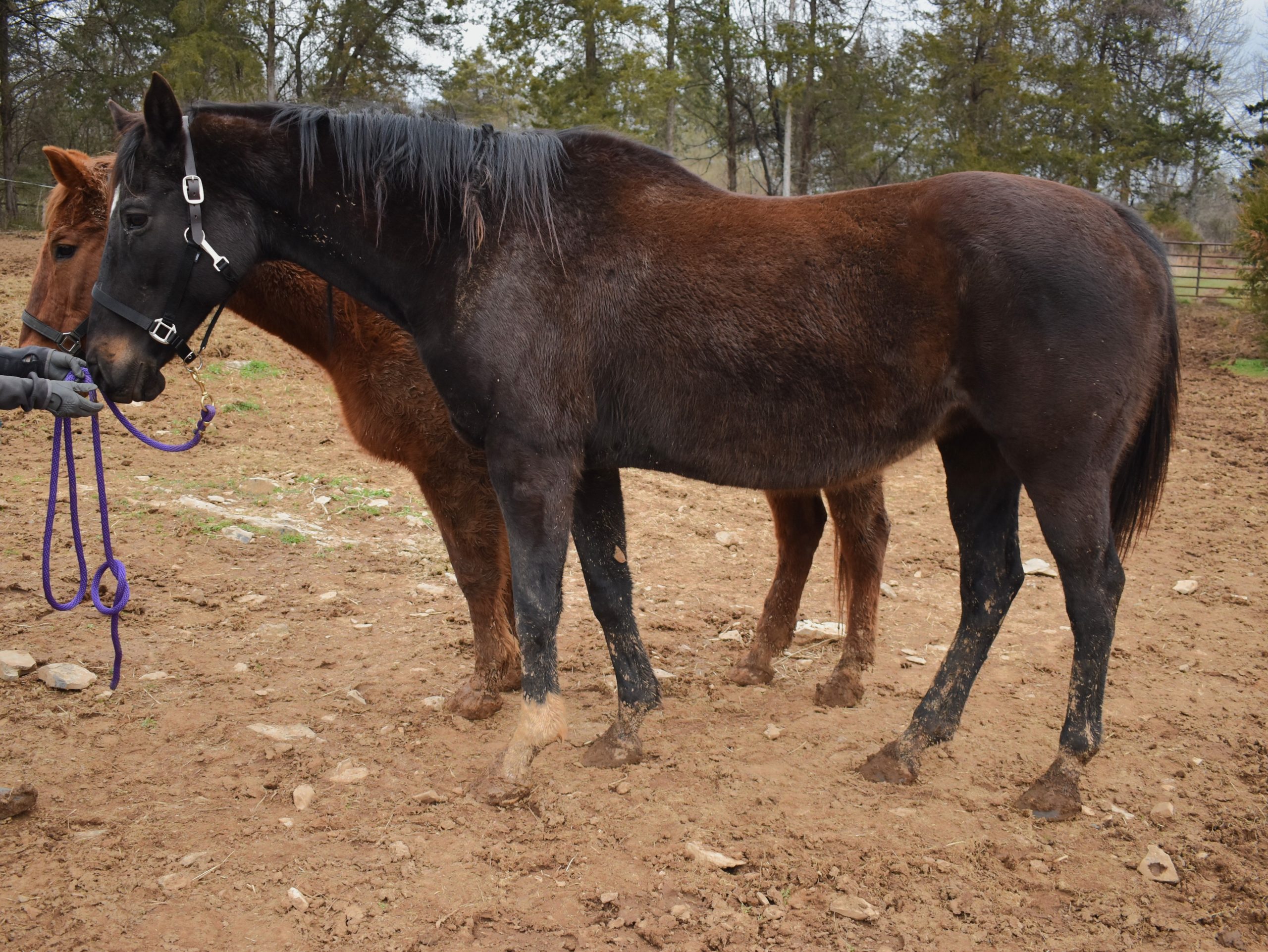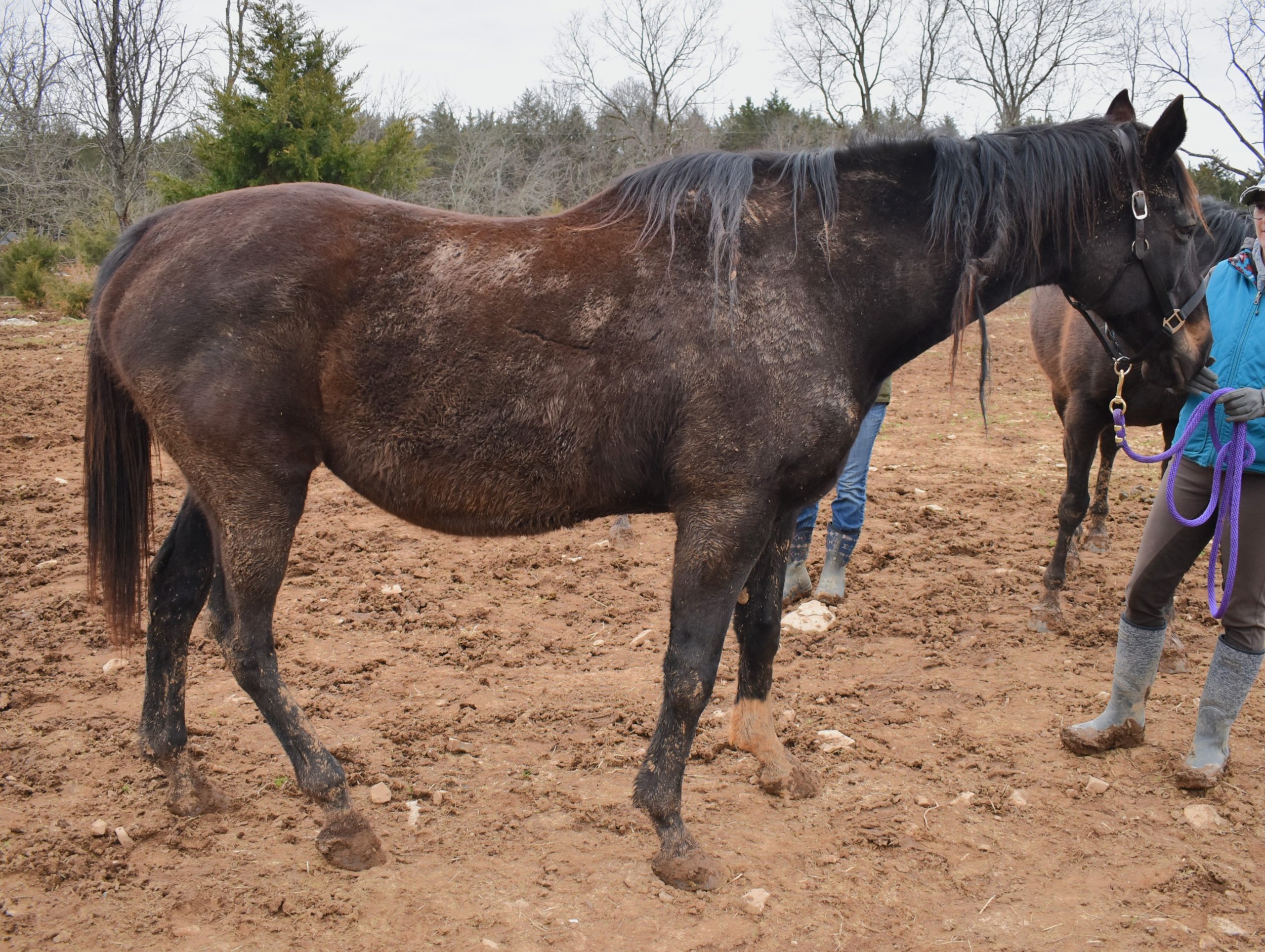 Belle maintains her weight well and has wintered successfully, unblanketed, with a simple feeding routine of once-daily grain and free-choice round bale access. At this time, she is not up to date on routine care beyond daily feeding. Her new owner should be prepared to address Coggins, vaccinations, deworming, dental, and farrier needs. She has been turned out successfully with both mares and geldings.