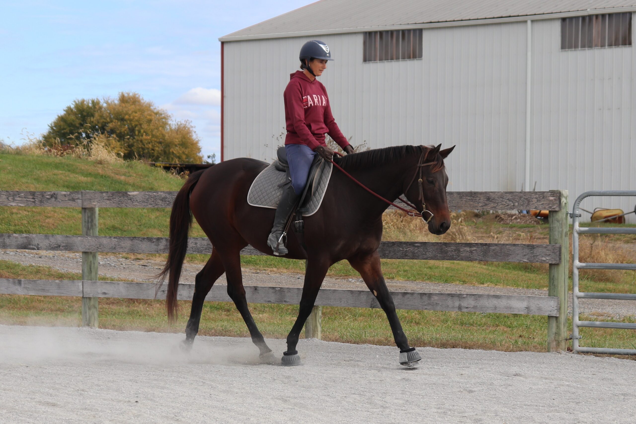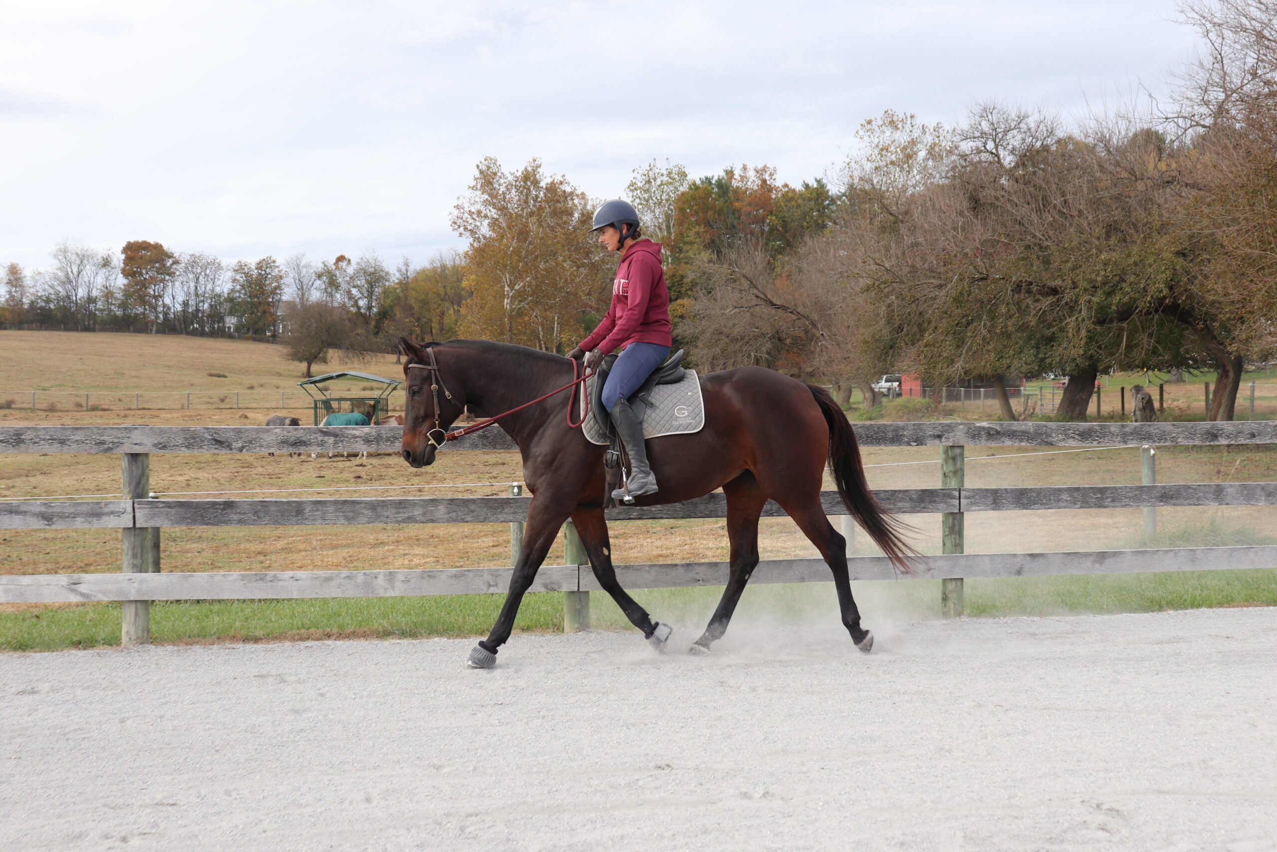 Birdie is generally very quiet and laidback, especially for a 6 year old OTTB mare, and has been easy to work around while tied for grooming and tacking. She can have days where she’s a little sassy with ear pinning behavior but we think most of the behavior is when she thinks she can get away with it with less confident handlers.