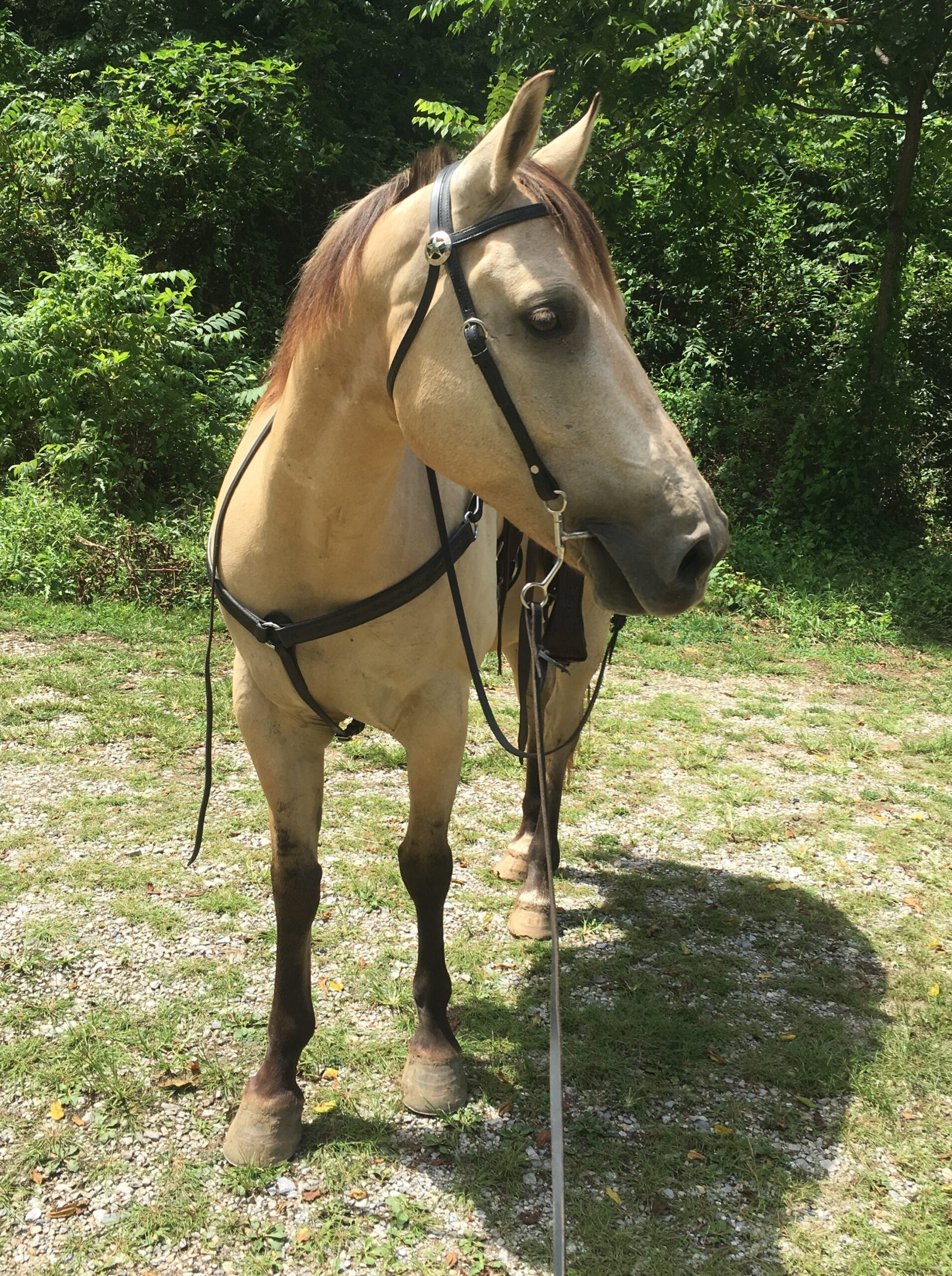 Buck is a good boy to handle and work around. He has excellent ground manners, stands well for grooming and tacking up, picks up all four hooves, and stands for fly spray. Buck is fond of treats, and will bend and stretch for a snack. His owner says he is a very smart boy with an excellent memory. In addition to riding, he could also be a great candidate for someone wanting to do more work with him on the ground.