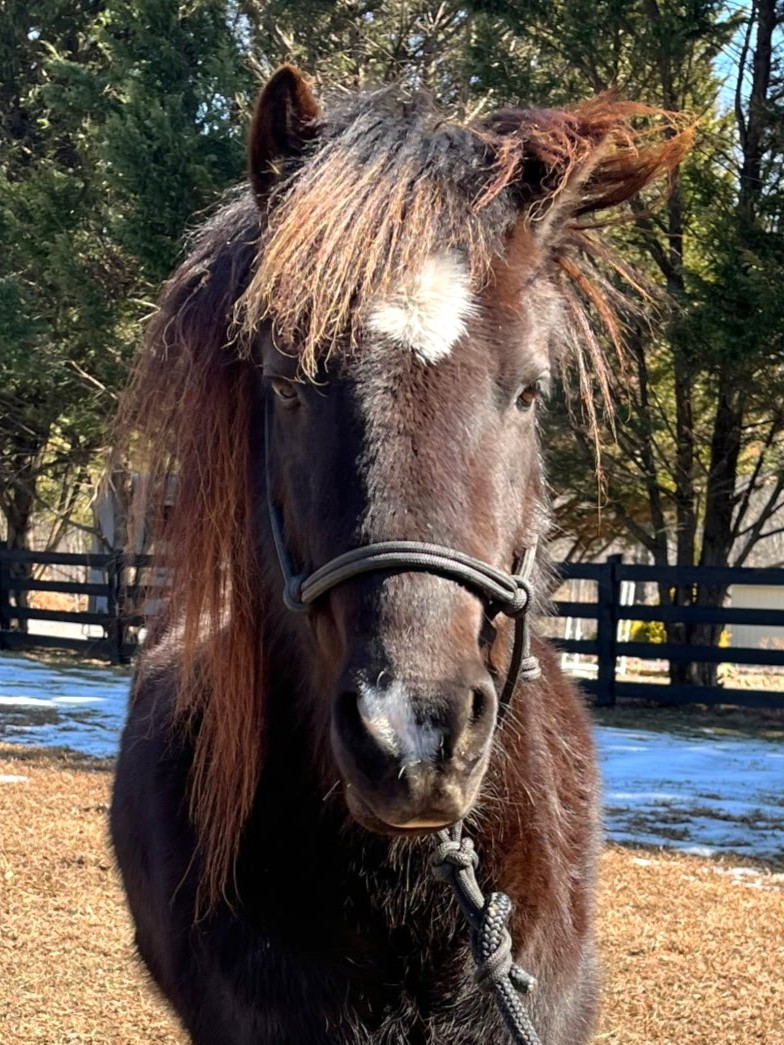 This approximately 5-year-old grade Welsh-type pony gelding may be small in stature (around 11.1h), but he makes up for it with a whole lot of personality. Purchased at auction in October 2024, Mickey's full history is unknown—but one thing is clear: he’s clever, affectionate, and always thinking… sometimes a little too much for his own good.