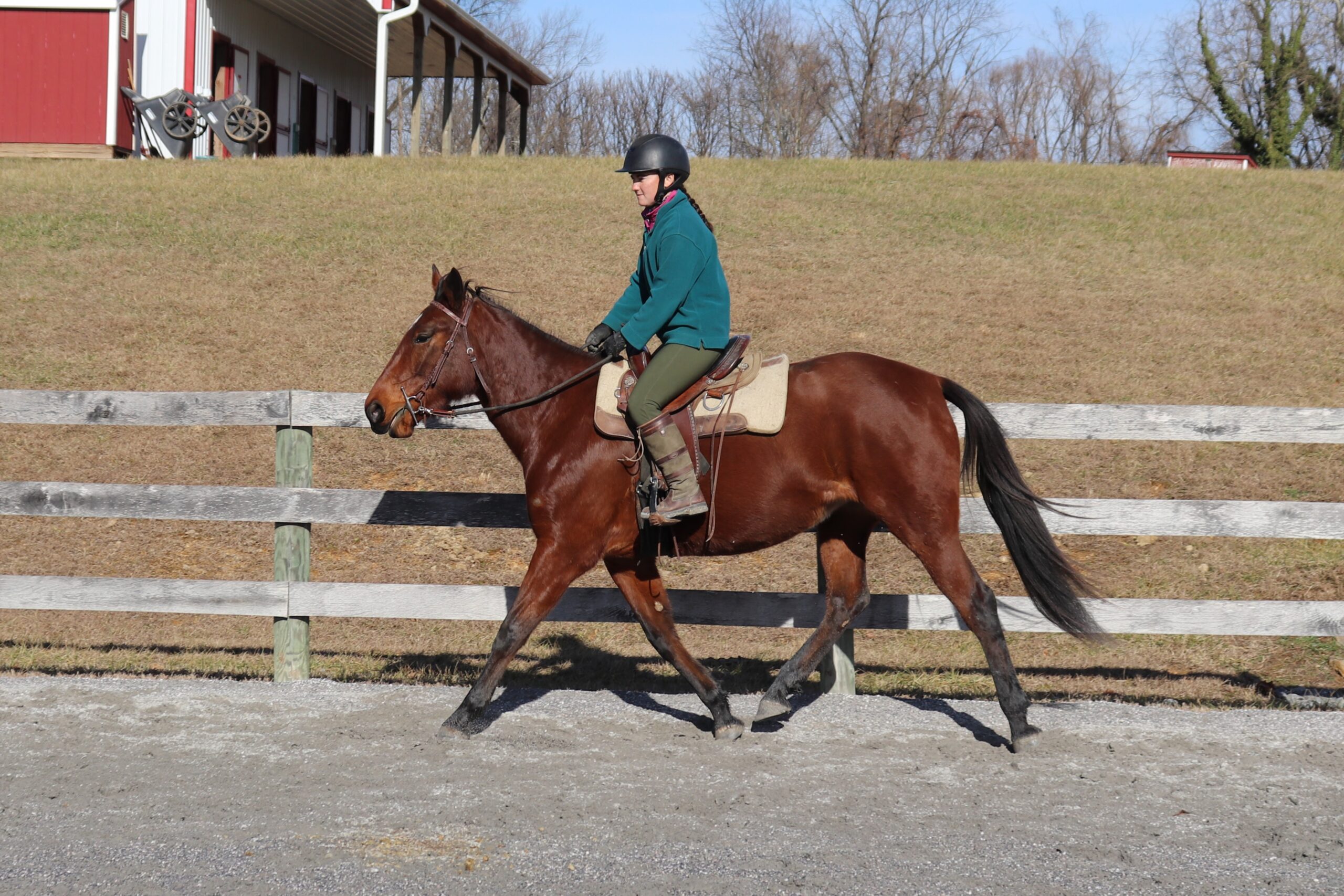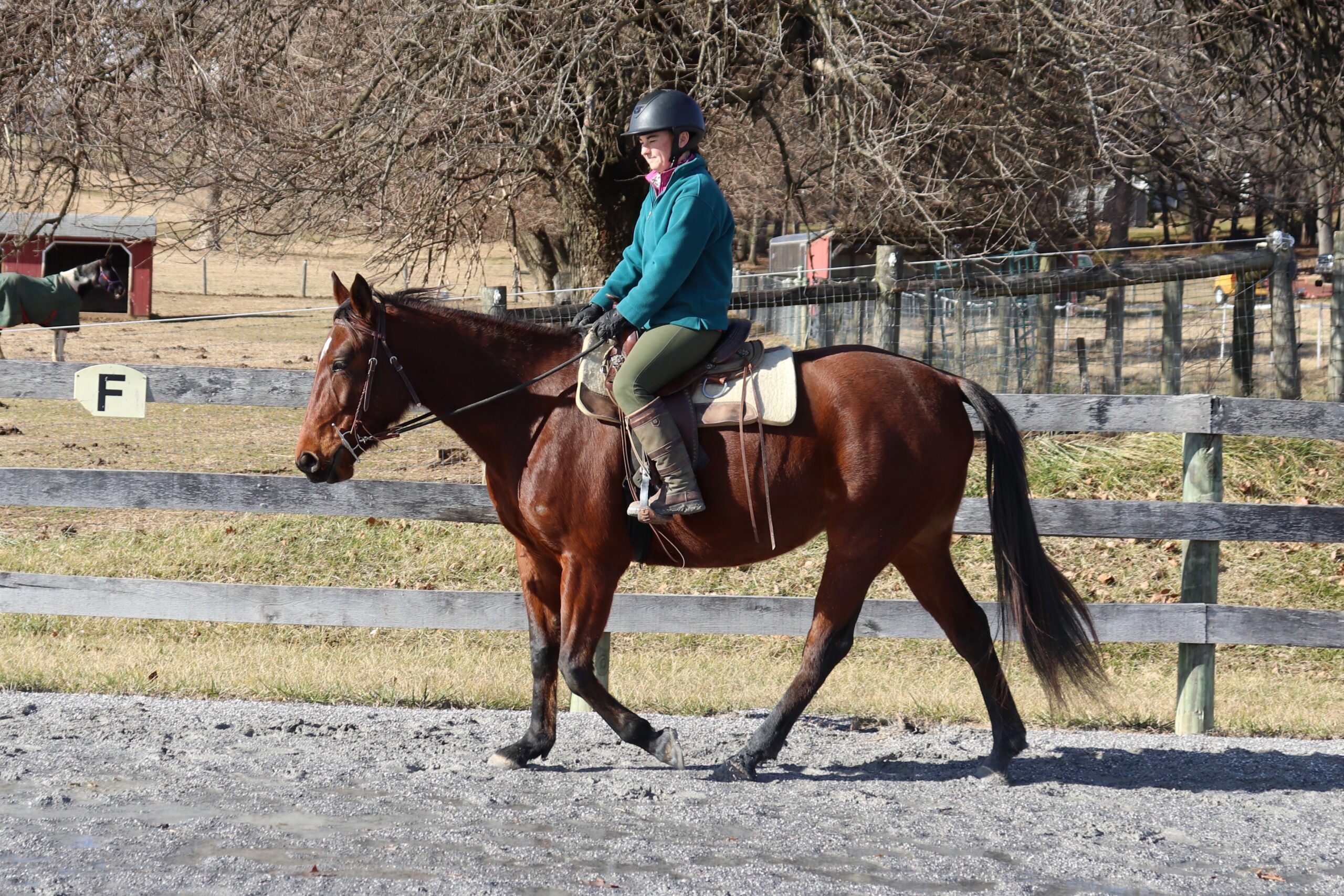 Nicolette is a 2021 unraced Standardbred mare (registered name "Badland's Gold"). She was started under saddle in a professional training program with Advantage Horsemanship with Scott Purdum. Upon returning to DEFHR, Nicolette has been ridden as consistently as the winter weather allows and has been doing SO WELL, even when she has days off in between sessions! Her rides are kept mainly at the walk/trot as we continue to develop her canter and balance on the ground. We think she is just about done growing, which has helped tremendously with her balance and self-carriage. Nicolette was bred to be a pacer, but as she has never been raced, she goes right into a large flowy trot. Nicolette has unlimited potential and can go in any direction! Although green, she has a wonderful head on her shoulders, is a quick learner, and tries hard to please! This lovely mare is going to have an amazing career ahead!