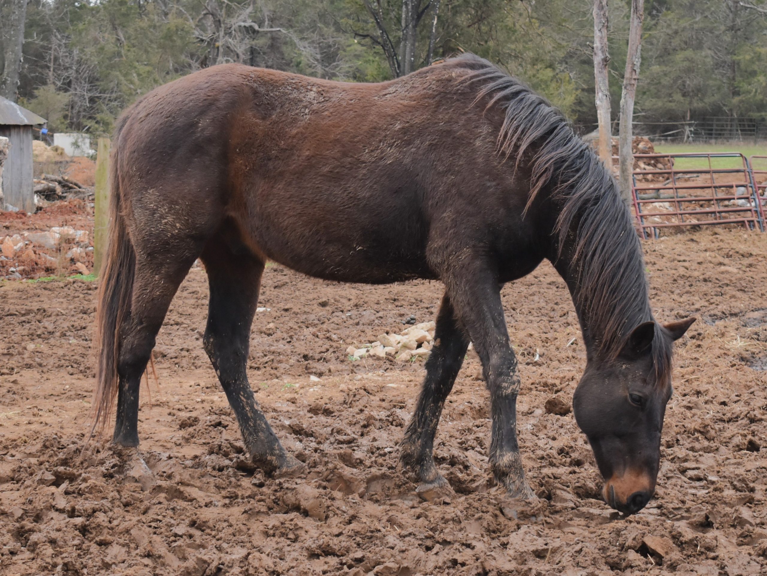 Roman is one of nine horses currently seeking placement through our program following the tragic passing of one owner, which has left the remaining elderly owner unable to continue their care. He is reported to be a registered, tattooed Thoroughbred; however, we were unable to catch him during our visit to confirm a tattoo or assess his age. Based on observation, we estimate he is likely in his mid to late teens and stands at least 16hh.