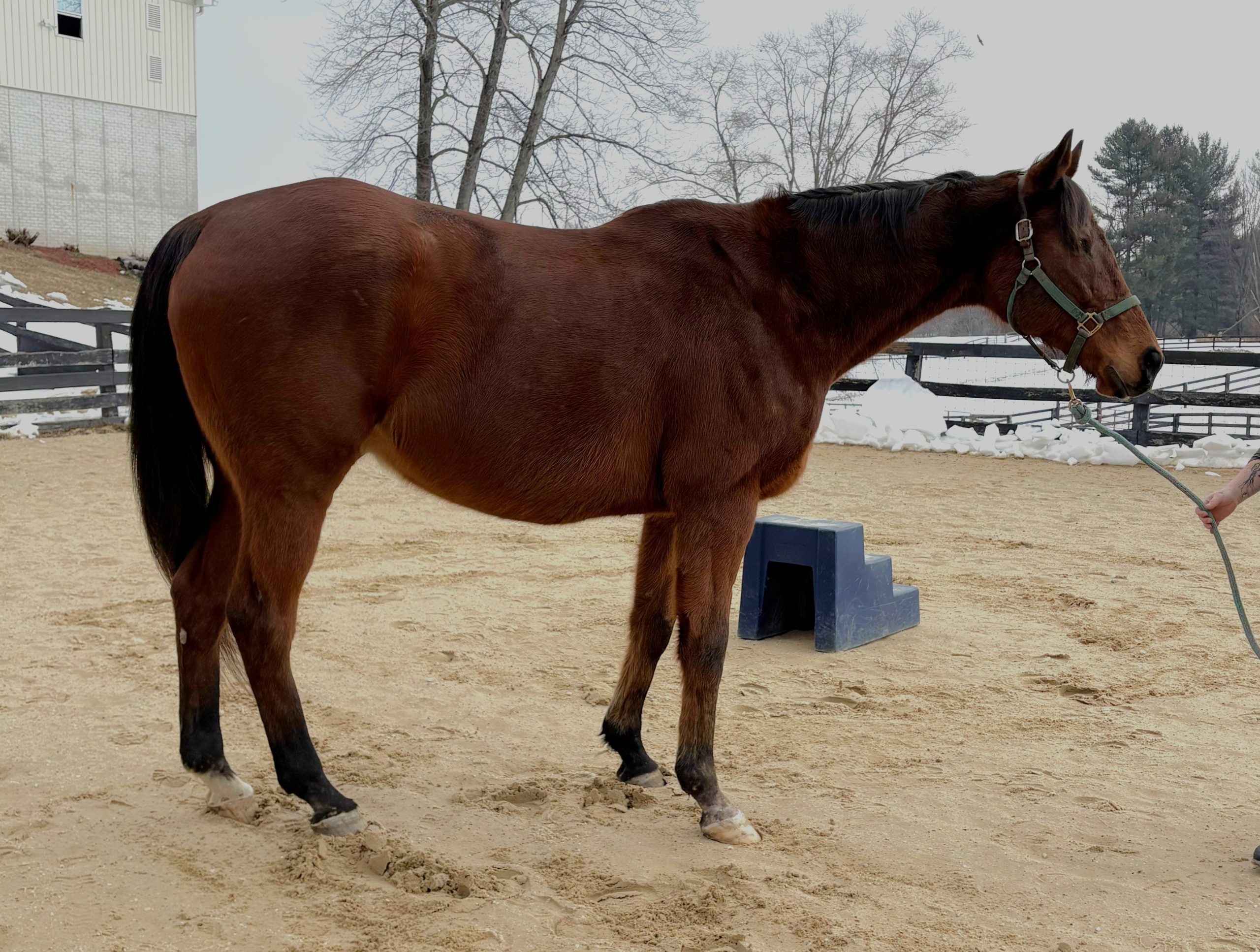 Big thrives in a turnout-based environment and currently lives outside 24/7 with other geldings. He sits toward the top of the herd hierarchy, but remains playful and social with his pasture mates, often engaging in friendly games and interactions. During inclement weather, he is happy to come into a stall as needed.